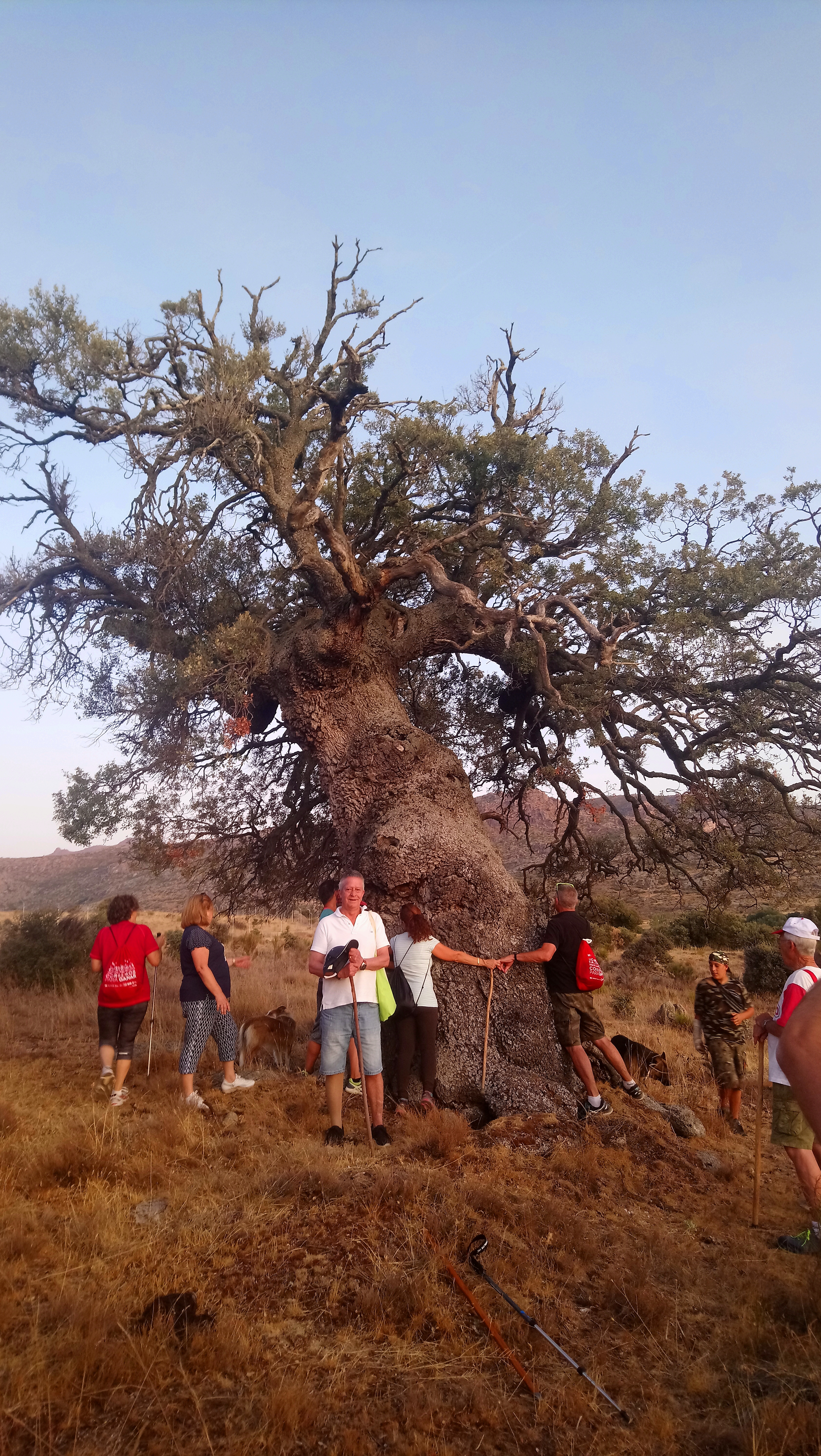 Con las endorfinas disparadas por la actividad física, nos vinimos arriba y decidimos subir hasta la encina centenaria, cuya circunferencia equivale a 7 personas abrazándola (como pudimos observar):