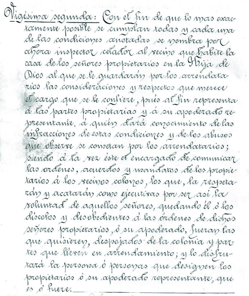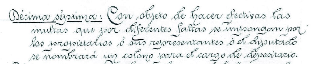 En esta quinta y última parte, terminaremos con el análisis de las cláusulas centradas en las figuras de control: el diputado, el depositario de las multas, el guarda, el celador y el celador de aguas. Algunos eran nombrados de entre el grupo de colonos.